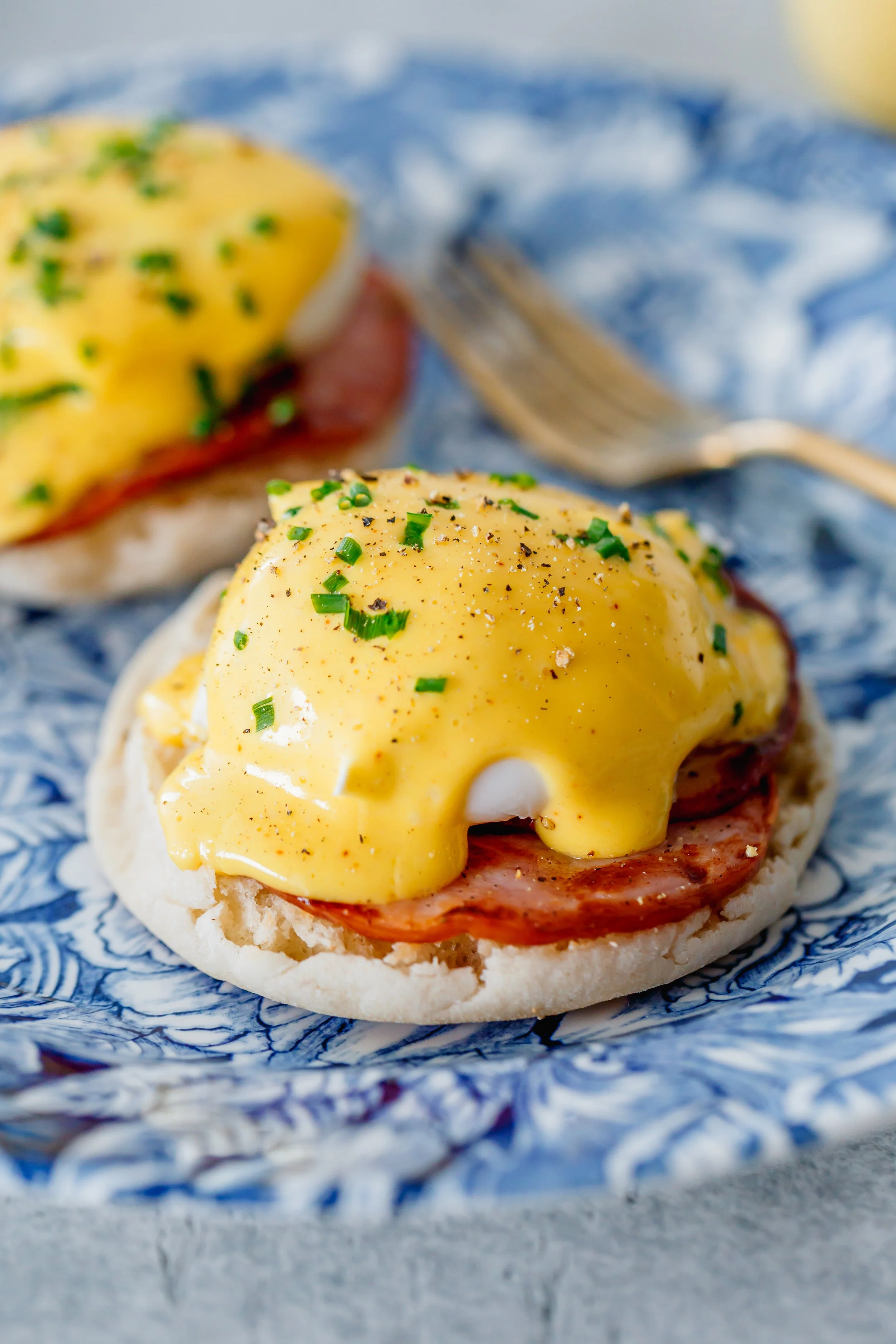 Top each muffin half with bacon, a poached egg, and spoon over hollandaise. Season with salt, pepper, and garnish with chives.