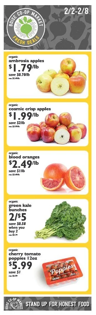 FRESH DEALS • FEB 2-8 Wednesday, February 2, 2022 6:00 AM Tuesday, February 8, 2022 10:00 PM Google Calendar ICS Get Fresh!Every week, we’ve got new Fresh Deals on the best organic produce the Treasure Valley has to offer. Stock up on your favorite fruits and veggies and save!