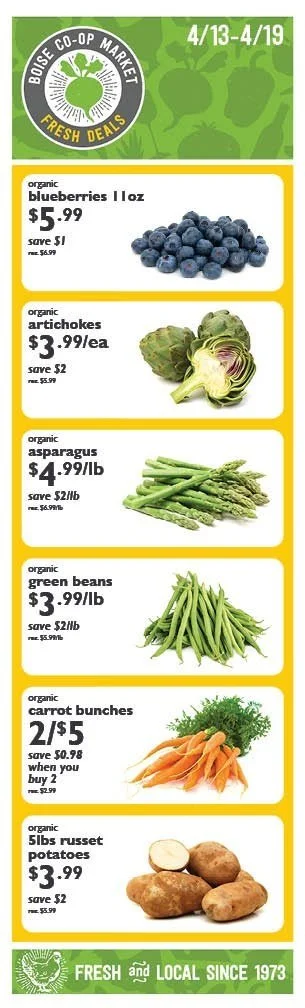 FRESH DEALS • APR 13-19 Wednesday, April 13, 2022 6:00 AM Tuesday, April 19, 2022 10:00 PM Google Calendar ICS Get Fresh!Every week, we’ve got new Fresh Deals on the best organic produce the Treasure Valley has to offer. Stock up on your favorite fruits and veggies and save!