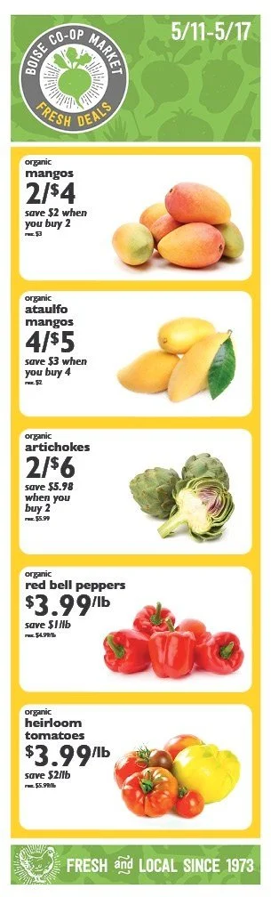 FRESH DEALS • MAY 11-17 Wednesday, May 11, 2022 6:00 AM Tuesday, May 17, 2022 10:00 PM Google Calendar ICS Get Fresh!Every week, we’ve got new Fresh Deals on the best organic produce the Treasure Valley has to offer. Stock up on your favorite fruits and veggies and save!
