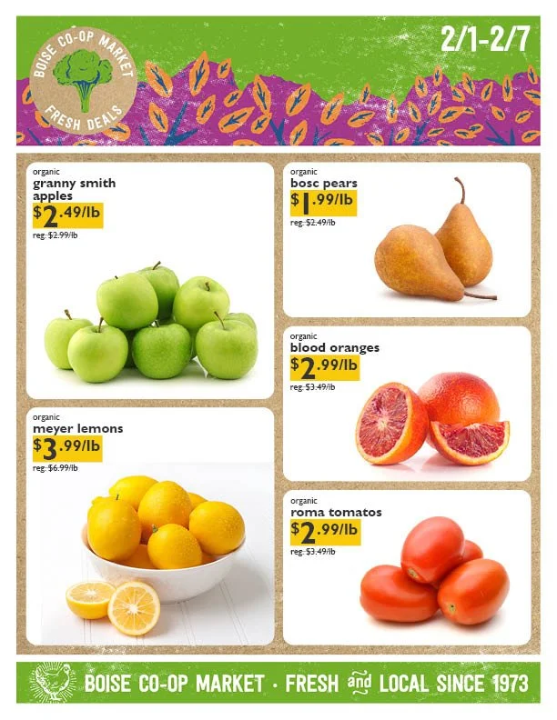 FRESH DEALS • FEB 1-7 Wednesday, February 1, 2023 6:00 AM Tuesday, February 7, 2023 10:00 PM Google Calendar ICS Get Fresh!Every week, we’ve got new Fresh Deals on the best organic produce the Treasure Valley has to offer. Stock up on your favorite fruits and veggies and save!