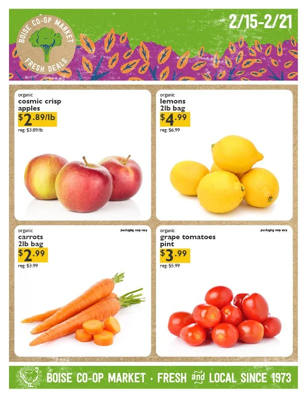 FRESH DEALS • FEB 15-21 Wednesday, February 15, 2023 6:00 AM Tuesday, February 21, 2023 10:00 PM Google Calendar ICS Get Fresh!Every week, we’ve got new Fresh Deals on the best organic produce the Treasure Valley has to offer. Stock up on your favorite fruits and veggies and save!