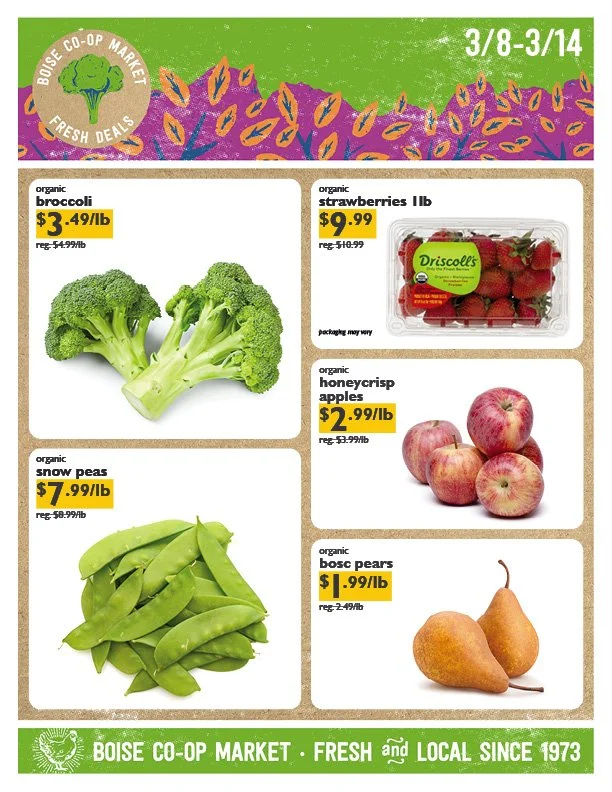 FRESH DEALS • MARCH 8-14 Wednesday, March 8, 2023 6:00 AM Tuesday, March 14, 2023 11:00 PM Google Calendar ICS Get Fresh!Every week, we’ve got new Fresh Deals on the best organic produce the Treasure Valley has to offer. Stock up on your favorite fruits and veggies and save!