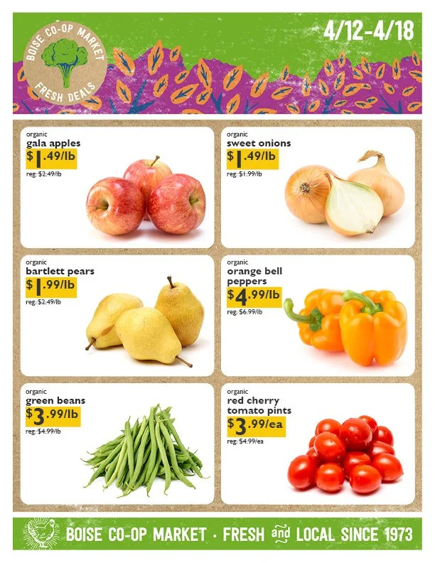 FRESH DEALS • APRIL 12-18 Wednesday, April 12, 2023 6:00 AM Tuesday, April 18, 2023 10:00 PM Google Calendar ICS Get Fresh!Every week, we’ve got new Fresh Deals on the best organic produce the Treasure Valley has to offer. Stock up on your favorite fruits and veggies and save!