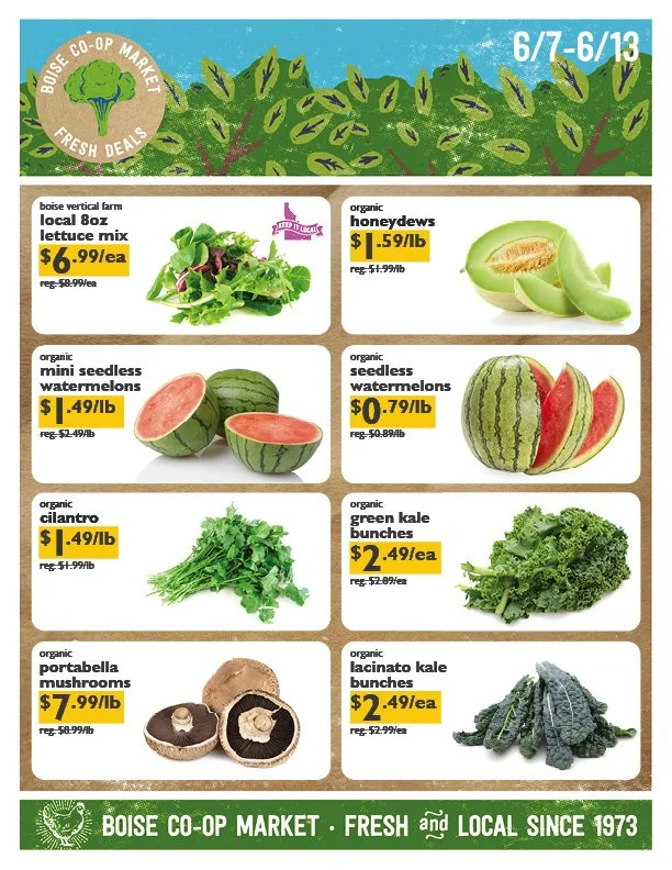 FRESH DEALS • JUNE 7-13 Wednesday, June 7, 2023 6:00 AM Tuesday, June 13, 2023 10:00 PM Google Calendar ICS Get Fresh!Every week, we’ve got new Fresh Deals on the best organic produce the Treasure Valley has to offer. Stock up on your favorite fruits and veggies and save!