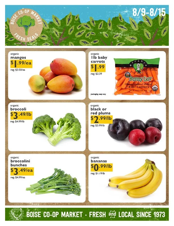 FRESH DEALS • AUG 9-15 Wednesday, August 9, 2023 6:00 AM Tuesday, August 15, 2023 10:00 PM Google Calendar ICS Get Fresh!Every week, we’ve got new Fresh Deals on the best organic produce the Treasure Valley has to offer. Stock up on your favorite fruits and veggies and save!