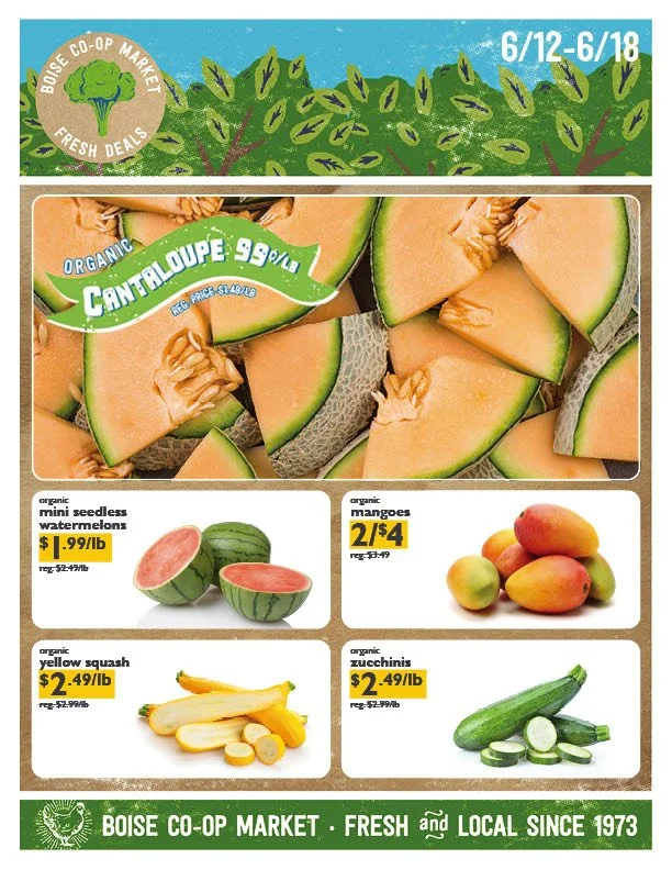 FRESH DEALS • JUNE 12-18 Wednesday, June 12, 2024 6:00 AM Tuesday, June 18, 2024 10:00 PM Google Calendar ICS Get Fresh!Every week, we’ve got new Fresh Deals on the best organic produce the Treasure Valley has to offer. Stock up on your favorite fruits and veggies and save!