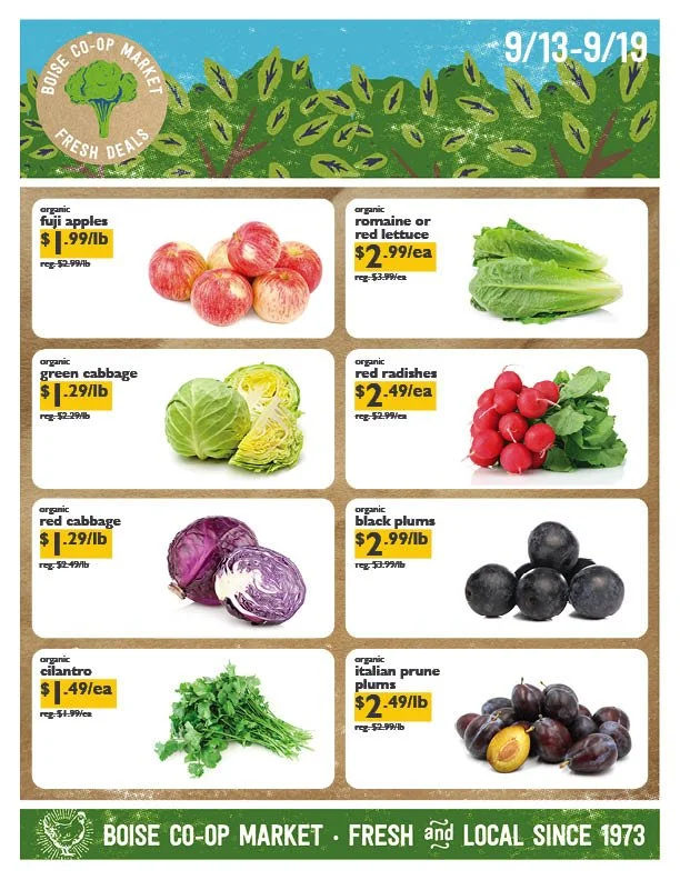 FRESH DEALS • SEP 13-19 Wednesday, September 13, 2023 6:00 AM Tuesday, September 19, 2023 10:00 PM Google Calendar ICS Get Fresh!Every week, we’ve got new Fresh Deals on the best organic produce the Treasure Valley has to offer. Stock up on your favorite fruits and veggies and save!