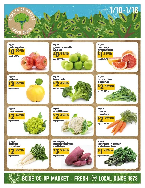 Back to All Events FRESH DEALS • JAN 10-16 Wednesday, January 10, 2024 6:00 AM Tuesday, January 16, 2024 10:00 PM Google Calendar ICS Get Fresh!Every week, we’ve got new Fresh Deals on the best organic produce the Treasure Valley has to offer. Stock up on your favorite fruits and veggies and save!