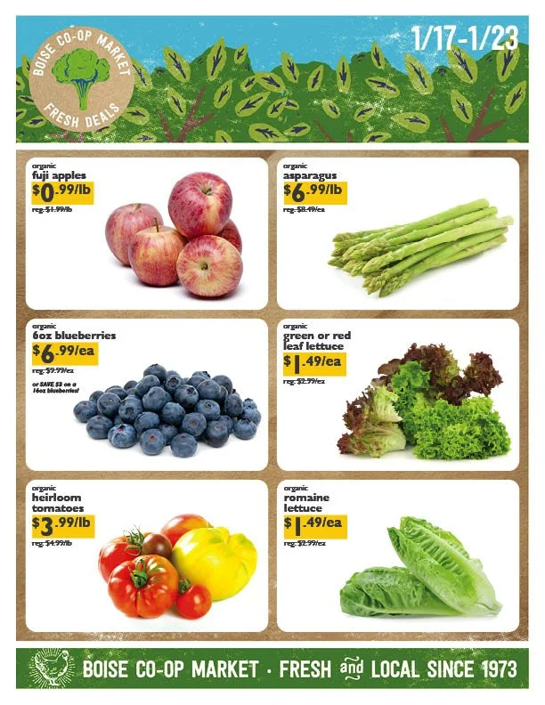 Back to All Events FRESH DEALS • JAN 17-23 Wednesday, January 17, 2024 6:00 AM Tuesday, January 23, 2024 10:00 PM Google Calendar ICS Get Fresh!Every week, we’ve got new Fresh Deals on the best organic produce the Treasure Valley has to offer. Stock up on your favorite fruits and veggies and save!