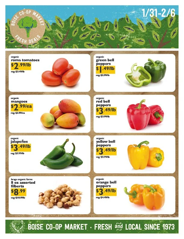 FRESH DEALS • JAN 31-FEB 6 Wednesday, January 31, 2024 6:00 AM Tuesday, February 6, 2024 10:00 PM Google Calendar ICS Get Fresh!Every week, we’ve got new Fresh Deals on the best organic produce the Treasure Valley has to offer. Stock up on your favorite fruits and veggies and save!