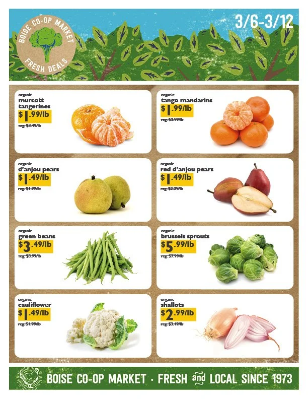 FRESH DEALS • MAR 6-12 Wednesday, March 6, 2024 6:00 AM Tuesday, March 12, 2024 10:00 PM Google Calendar ICS Get Fresh!Every week, we’ve got new Fresh Deals on the best organic produce the Treasure Valley has to offer. Stock up on your favorite fruits and veggies and save!