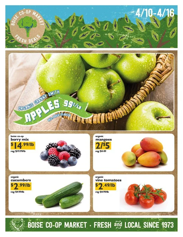 FRESH DEALS • APR 10-16 Wednesday, April 10, 2024 6:00 AM Tuesday, April 16, 2024 10:00 PM Google Calendar ICS Get Fresh!Every week, we’ve got new Fresh Deals on the best organic produce the Treasure Valley has to offer. Stock up on your favorite fruits and veggies and save!