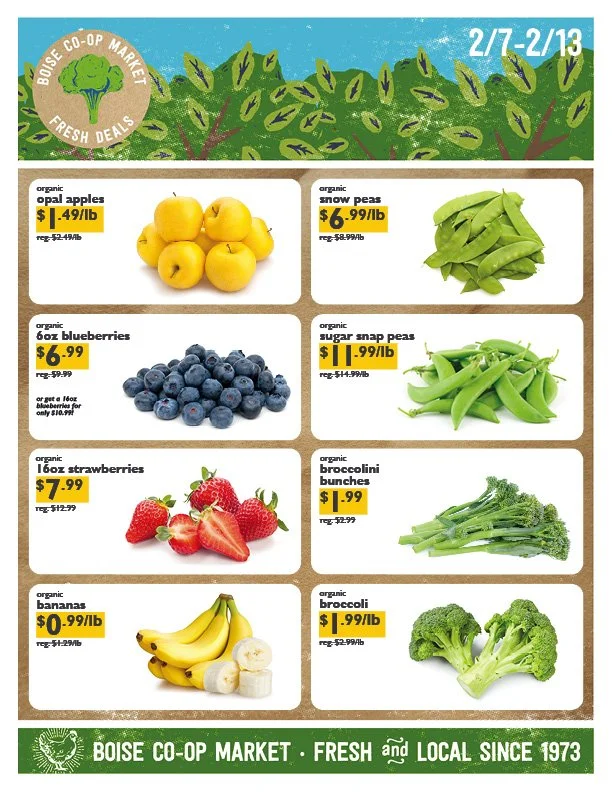 FRESH DEALS • FEB 7-13 Wednesday, February 7, 2024 6:00 AM Tuesday, February 13, 2024 10:00 PM Google Calendar ICS Get Fresh!Every week, we’ve got new Fresh Deals on the best organic produce the Treasure Valley has to offer. Stock up on your favorite fruits and veggies and save!