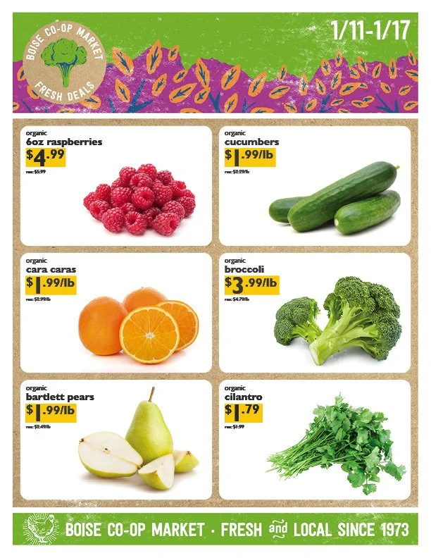 FRESH DEALS • JAN 11-17 Wednesday, January 11, 2023 6:00 AM Tuesday, January 17, 2023 10:00 PM Google Calendar ICS Get Fresh!Every week, we’ve got new Fresh Deals on the best organic produce the Treasure Valley has to offer. Stock up on your favorite fruits and veggies and save!